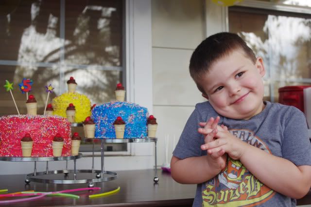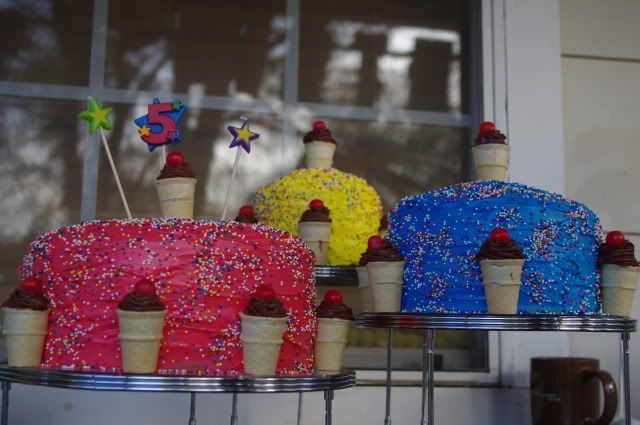 I found the little bitty cones at Target and stuffed them with the trimmings that I cut off the top of the cake and then used the chocolate frosting in a squirt can to make the top look like ice cream, and then topped with a sour cherry. :-)