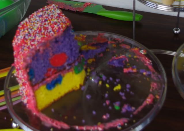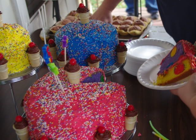 To do this, I made the cake batter and separated it and colored it with gel food coloring. You want the batter to be the color you want the final result to be. Then I used my cake ball/doughnut hole maker (bought at Target) and made several different colored balls. Then when I poured the cake in the pans, I put the cake balls into the batter. I cut some in half to put against the edge of the pan, although, with stacking cakes and frosting it, you can't really tell, so next time I will just do the full ones. Then I colored the frosting again with the gel food coloring (you can find it in the craft section of Walmart by the wedding cake stuff). Then I covered it in sprinkles.